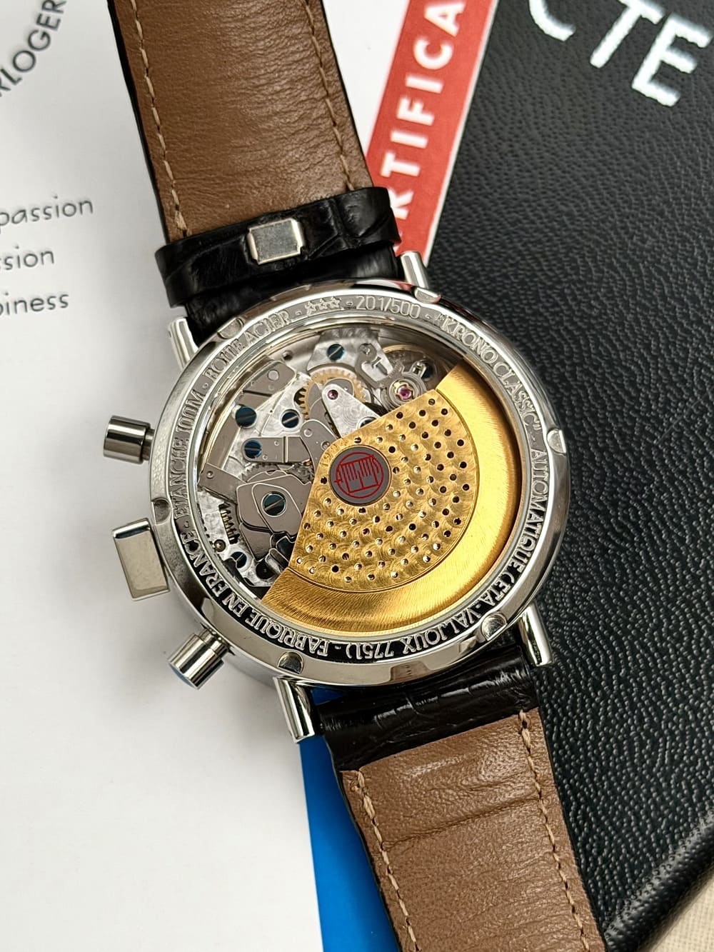 El Valjoux 7751 aporta una base mecánica sólida, conocida por su robustez y versatilidad 🔧. Una máquina que ha demostrado su FIABILIDAD a lo largo del tiempo, aquí utilizada como soporte para una propuesta estética mucho más libre, incluso certificado como cronómetro. Técnica tradicional al servicio de una visión completamente distinta.