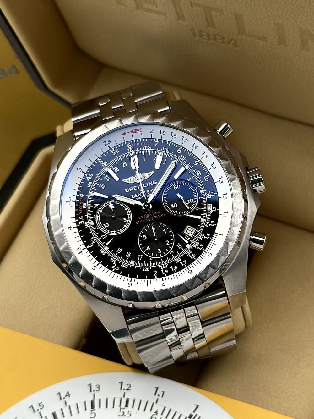 El bisel cuenta otra historia aún más intensa. Su superficie moleteada -ese PATRÓN EN CUADRÍCULA que imita los MANDOS METÁLICOS DE BENTLEY 😍- transforma la pieza en un pequeño panel de conducción. Y su escala logarítmica no es un simple taquímetro, sino un instrumento capaz de calcular velocidades promedio en distancias variables. Una herramienta noble nacida para los amantes del automovilismo más puro ⏱️. No es sólo una intención, es una acción.