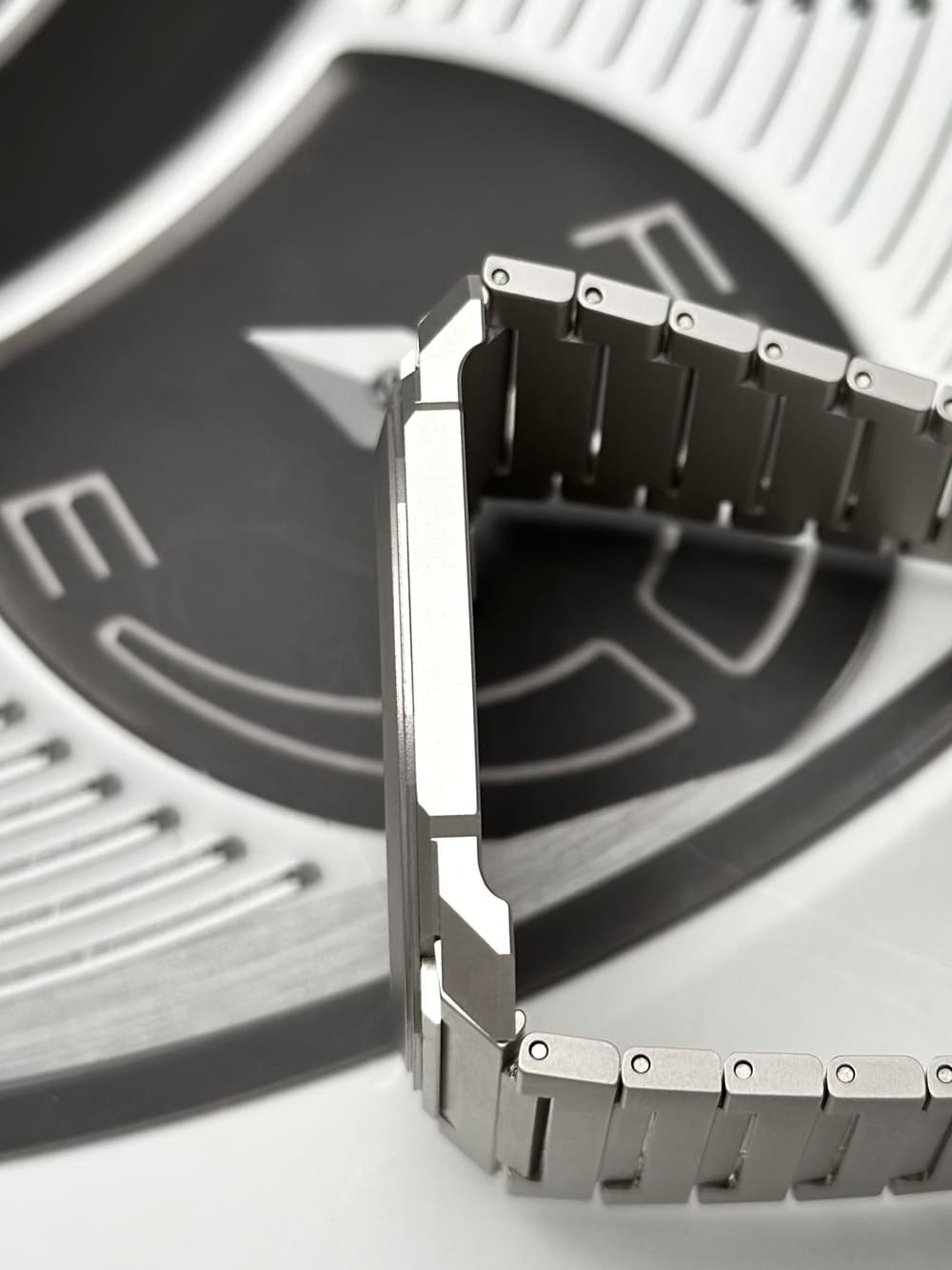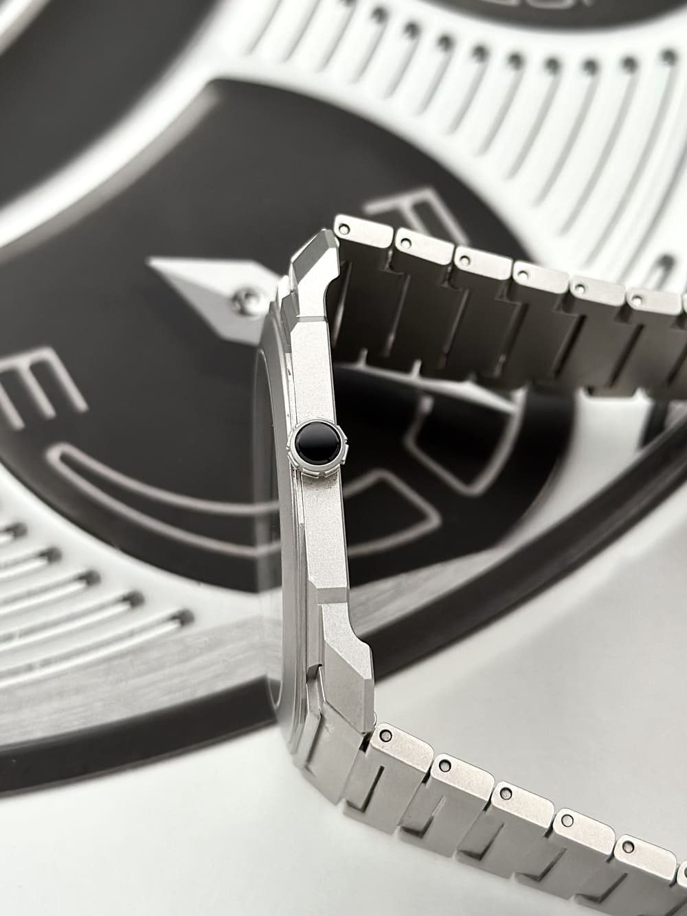 La caja en titanio arenado muestra un tono gris claro único, sobrio y elegante, que absorbe la luz con naturalidad. No es DLC negro ni acero brillante: es titanio mate, refinado, que hace brillar las facetas del octógono y convierte la luz en parte del diseño. El bisel con aristas netas y esa figura octagonal en el borde del dial refuerzan la idea de arquitectura portátil. Incluso la corona con inserto de cerámica es un detalle revelador: contraste material, durabilidad y coherencia visual.