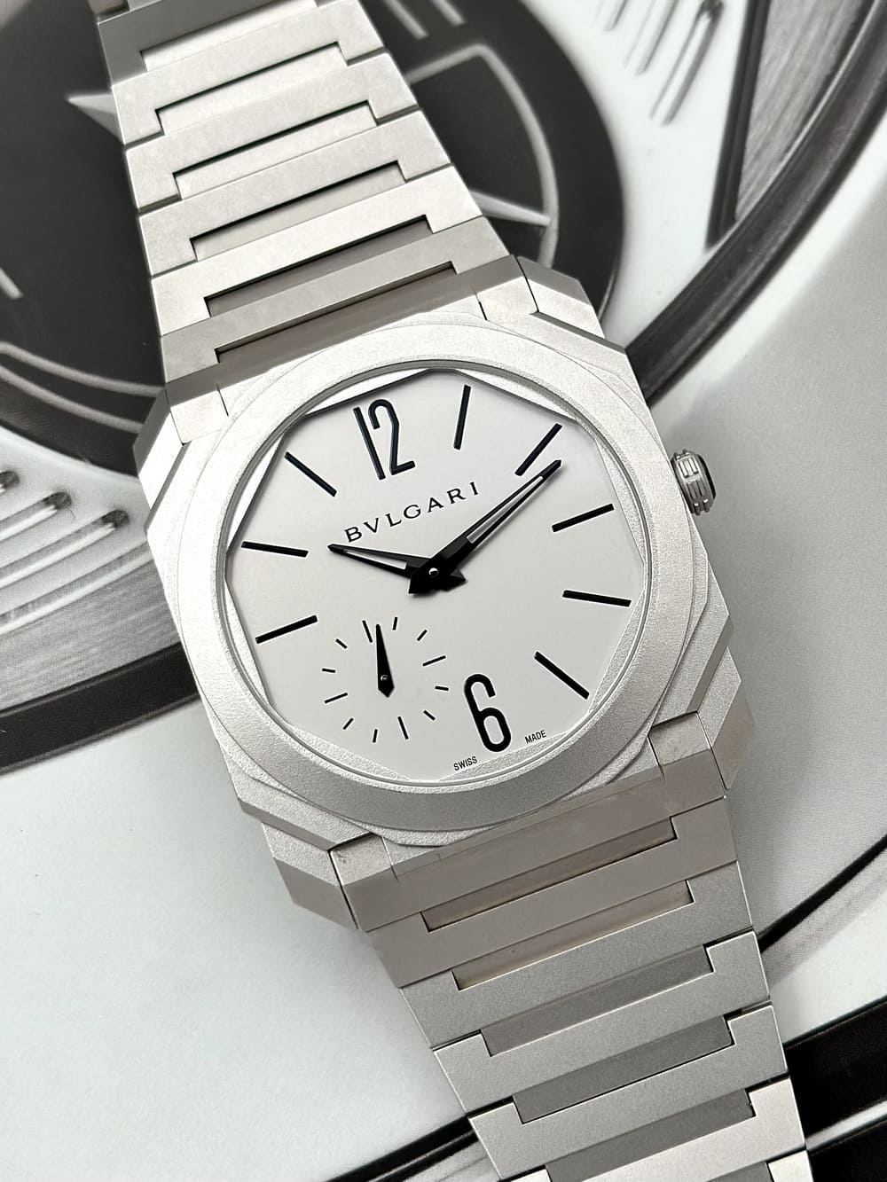 El brazalete integrado en titanio completa la experiencia. Flexible, fluido, ergonómico, convierte al Octo Finissimo en un reloj para todo uso: traje, informal, viaje o ceremonia. Sacárselo es igual de impactante: en la mano se siente distinto a cualquier otro, casi futurista, pero cargado de herencia romana.