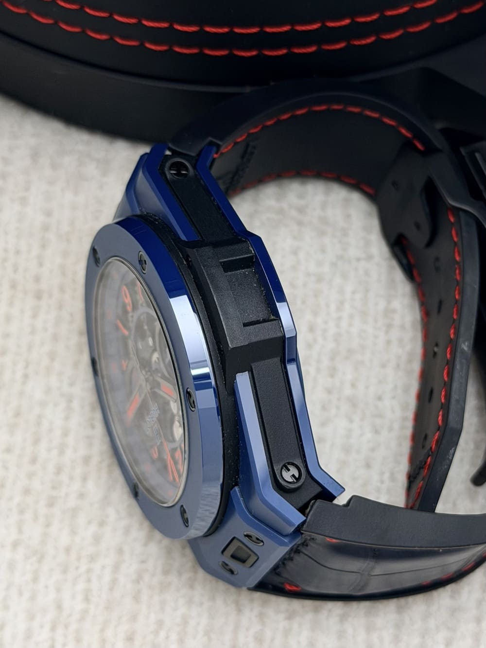 Sus 45 milímetros transmiten PRESENCIA FIRME, pero la cerámica y el titanio equilibran el peso con una LIGEREZA SORPRENDENTE en muñeca, que se complementa con la comodidad del calce del caucho. Una arquitectura contemporánea que combina vanguardia de diseño y comodidad… tal cual la promesa original de Hublot.