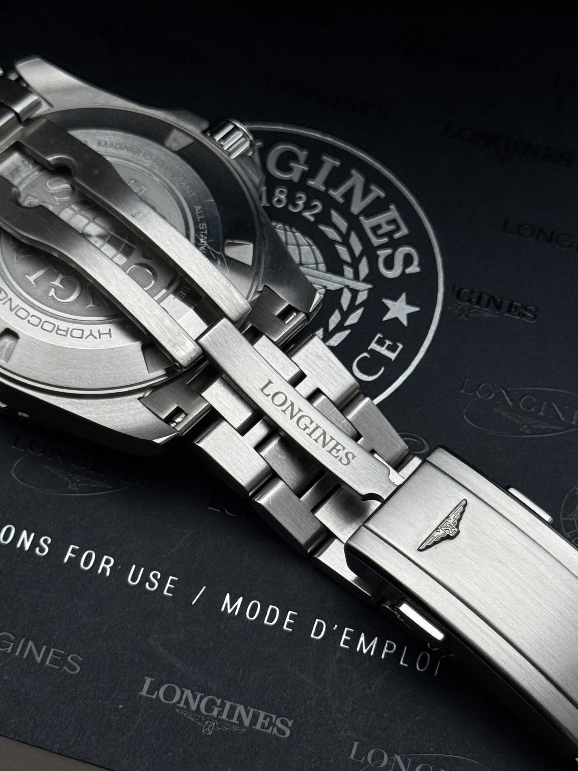 Y por dentro… aún más seriedad: el calibre L844.5, fabricado por ETA exclusivamente para Longines, con espiral de silicio, 72 horas de reserva y resistencia antimagnética, se comporta con la solidez que este diseño insinúa. Todo se ensambla sobre una potente caja de 43 milímetros, con un brazalete de acero cepillado que incluye microajuste y extensión de buceo. No se necesita otro reloj para nada.
