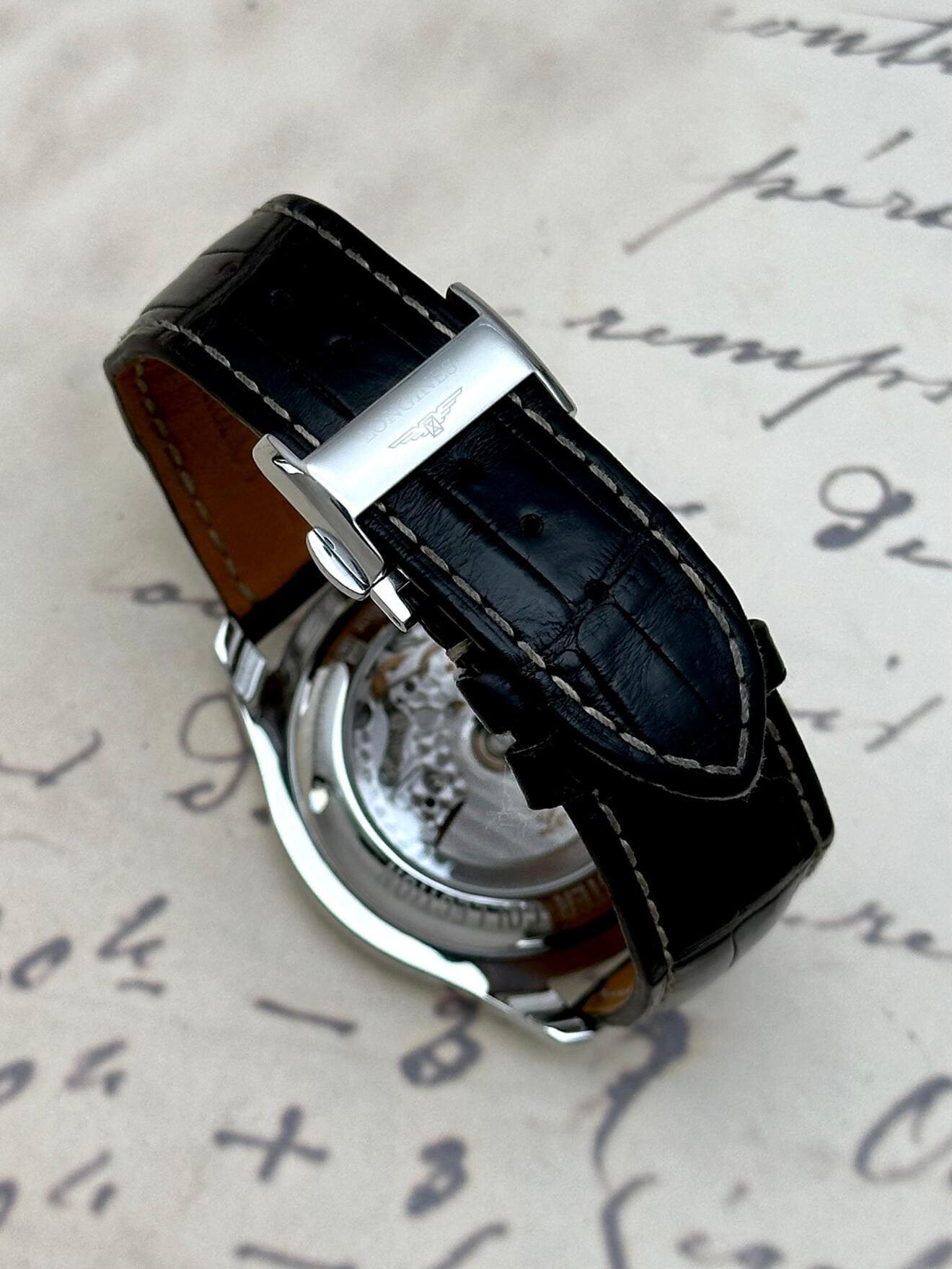 Pudiera pensarse que es demasiado grande en razón de sus complicaciones, pero no: 42 mm de diámetro lo hacen una pieza irresistible, es un reloj elegante letal, no perdona 🤝. En cuanto a su diseño, es la elegancia, el arte hecho reloj. Números Breguet negros en una esfera blanca con una textura de «grano de cebada» -como lo expresa Longines-, combinando el disco de la fase lunar con las manecillas de acero azuladas… hay todo un mundo ahí en frente 😍.