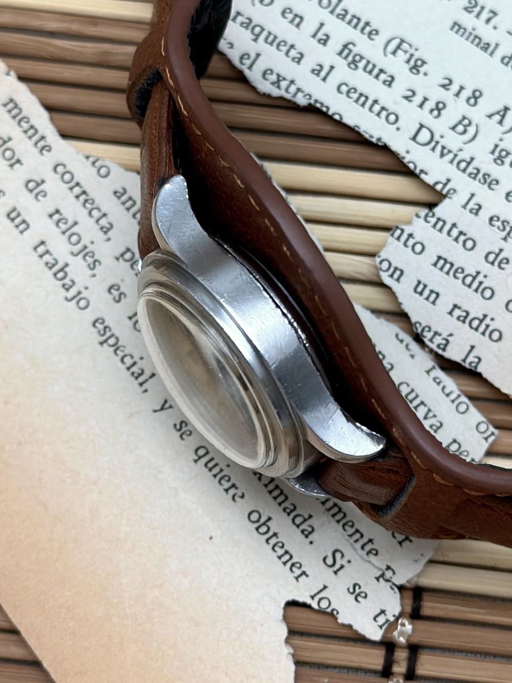 En la muñeca, sus 32 milímetros son un recordatorio de cómo la proporción no se mide solo en tamaño, sino en intención: compacto, ligero, vestido para la ocasión con su uniforme de cuero, abrazando la caja y ampliando su carácter táctico 🕰️. Por dentro, el motor de este tanque aéreo es el calibre 10L de Longines, un destacable movimiento manual de manufactura propia con segundero central, cuando la regla general eran los sub-segunderos 👌. Este legendario calibre ha demostrado ser robusto y preciso, pasen las décadas que pasen. Un auténtico testimonio de la independencia técnica que definía a la firma en aquellos años 🏭: ESTO ERA LONGINES, creaciones como esta hicieron a esta firma tan grande.