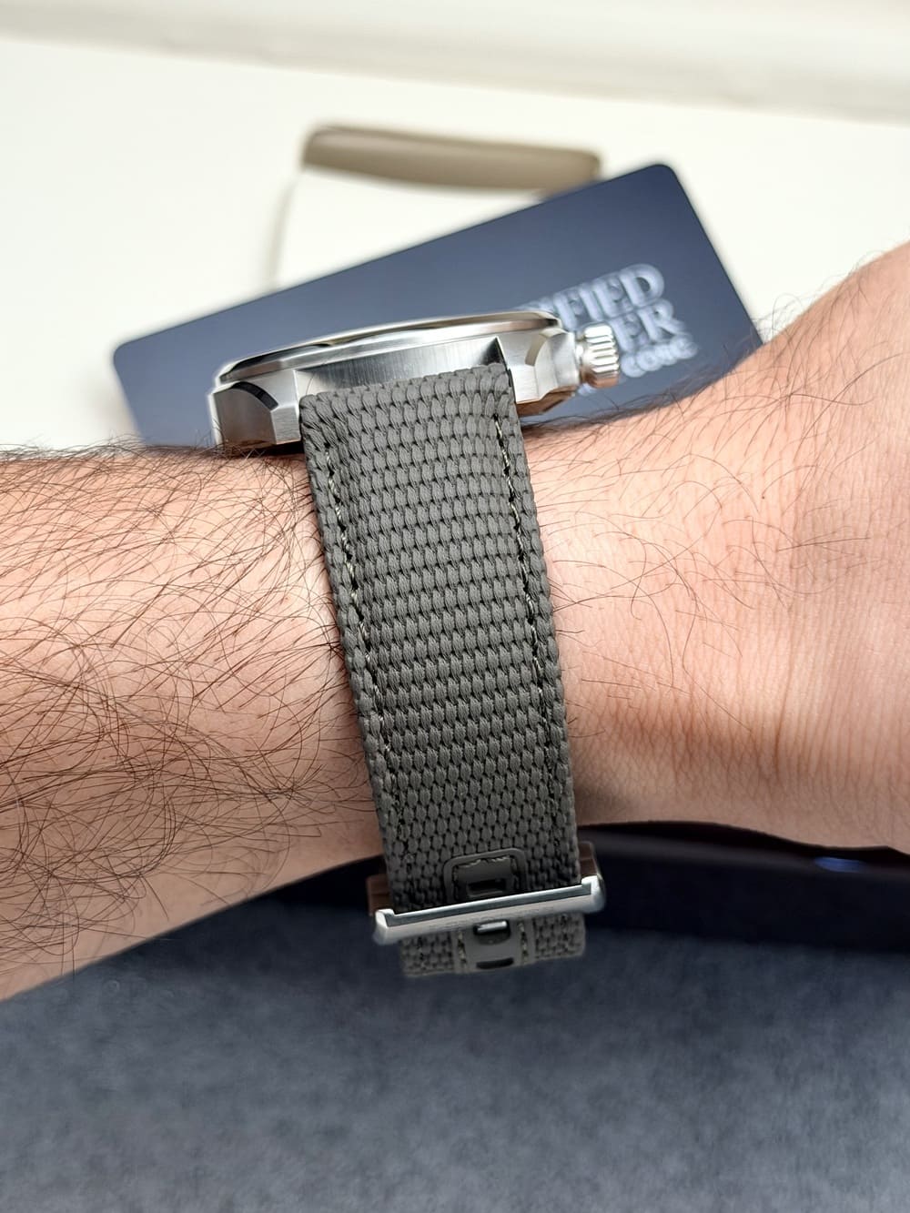 La correa de caucho gris con diseño tejido introduce un contraste moderno que equilibra la herencia histórica del modelo. FLEXIBLE, RESISTENTE Y CÓMODA, se integra de forma simple a la caja, aportando un matiz contemporáneo sin perder coherencia estética.