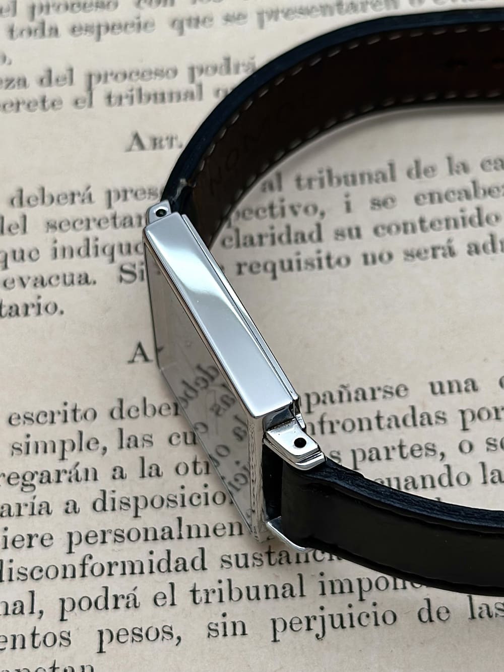 Pero hablemos del diseño, el CUADRADO PERFECTO de su caja de acero pulido, el espíritu de la escuela Bauhaus, por su énfasis en la funcionalidad y la estética minimalista, pero con un giro impredecible, casi excéntrico en su legibilidad: manecillas de un azul templado con un fondo negro… hay que hacerlas reflejar para leerlo 😮💨. ¡NO TIENE SENTIDO! Y por eso nos encanta: acá lo importante no es ver la hora, lo importante es el paso del tiempo.