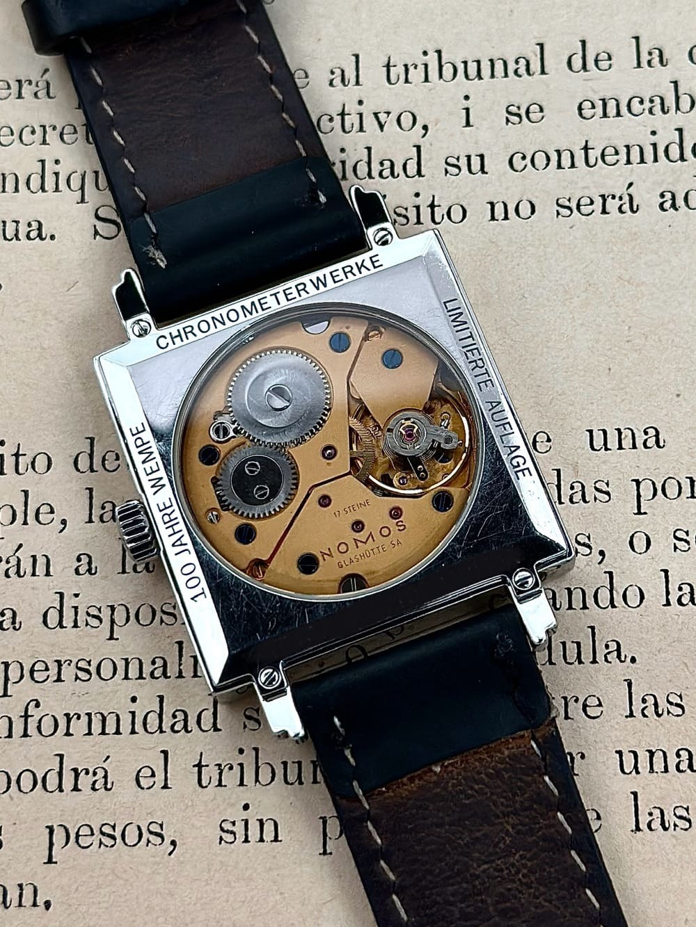 En su interior viene la especialidad de NOMOS: late el calibre NOMOS 1TS, un movimiento mecánico de cuerda manual que cimentó la base de la fama mecánica de la firma, el ADN. Este calibre, símbolo de la independencia relojera, revela a través del fondo transparente una obra de AUTÉNTICA ARTESANÍA ALEMANA 🇩🇪: tornillos azulados y una atención al mecanismo raro de ver en 2005.