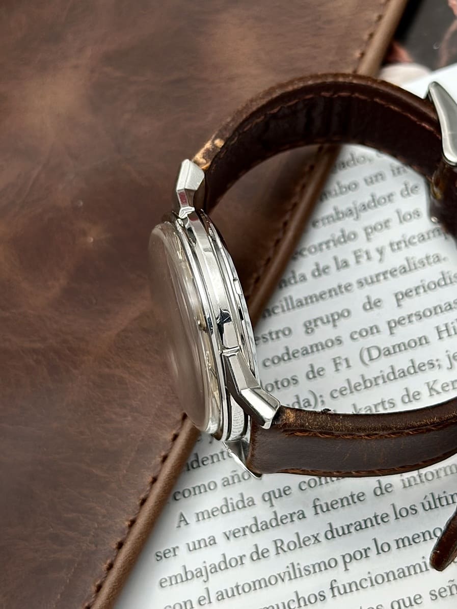Su caja de acero de 34 milímetros, con asas también hermosamente facetadas de tipo «dog leg», tensas y elegantes, abraza un fino bisel que abre el protagonismo al dial, no sin antes permitir un uso ligeramente más grande que el clásico reloj de 34 mm, con una distancia de asa a asa generosa de 43 mm.