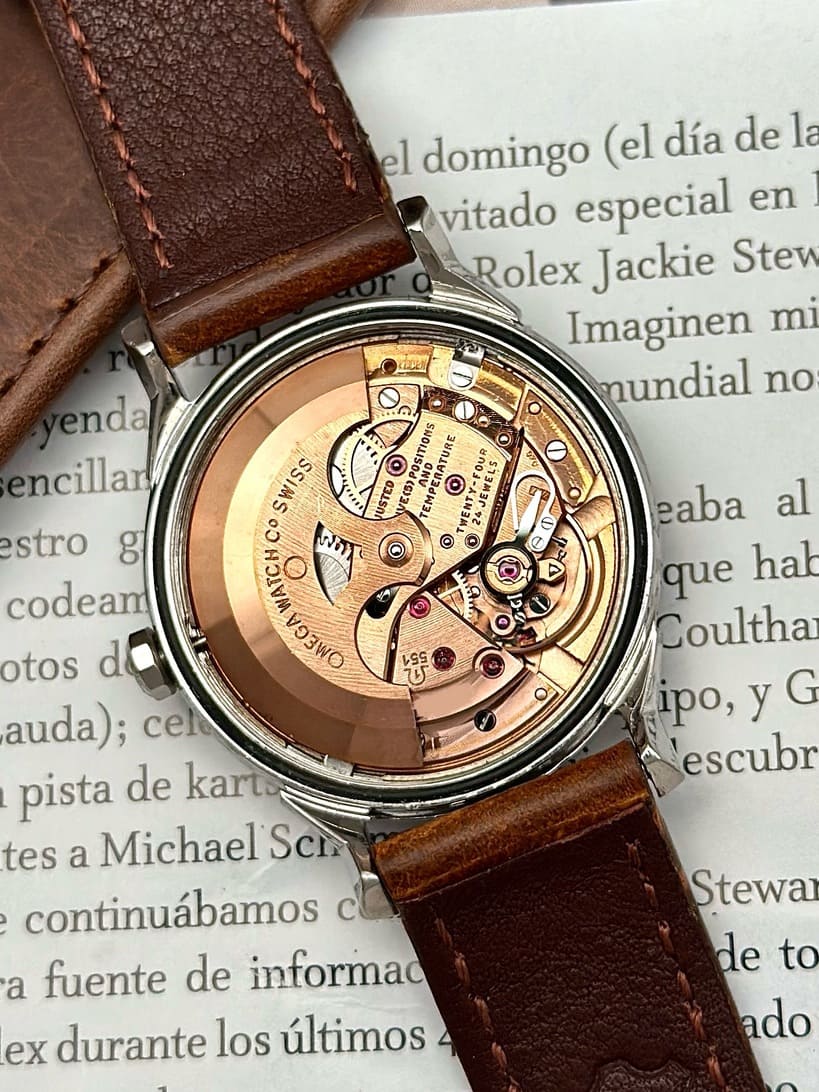 En el corazón late el calibre 551, un sólido movimiento automático de manufactura propia de Omega llevado al cielo: certificado cronómetro y ajustado a distintas posiciones, todos los esfuerzos para lograr que, ya muchas décadas después, podamos reconocerlo abiertamente por su precisión y fiabilidad.