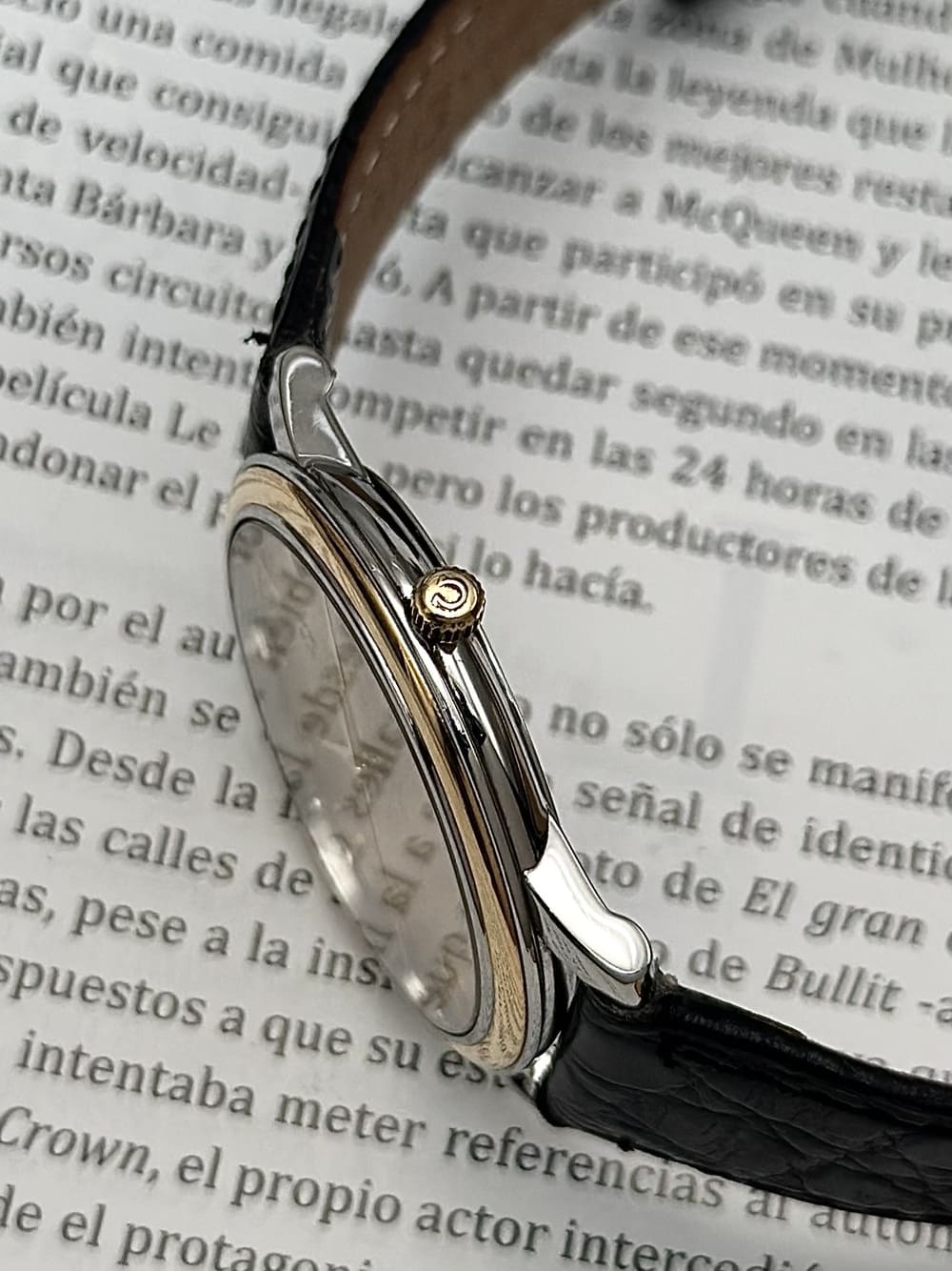 Sus 35 milímetros se sienten pensados para QUIENES VALORAN EL REFINAMIENTO CLÁSICO 🕰️: nada sobra, nada forcejea por llamar la atención, simplemente está ahí con confianza, con sabiduría. El cuerpo y las asas en acero inoxidable entregan un brillo limpio, mientras el bisel y la corona en oro amarillo de 18 quilates añaden un contraste que se integra con naturalidad, aportando un toque cálido que parece encenderse con la luz del día 🌅… una armonía hermosa.