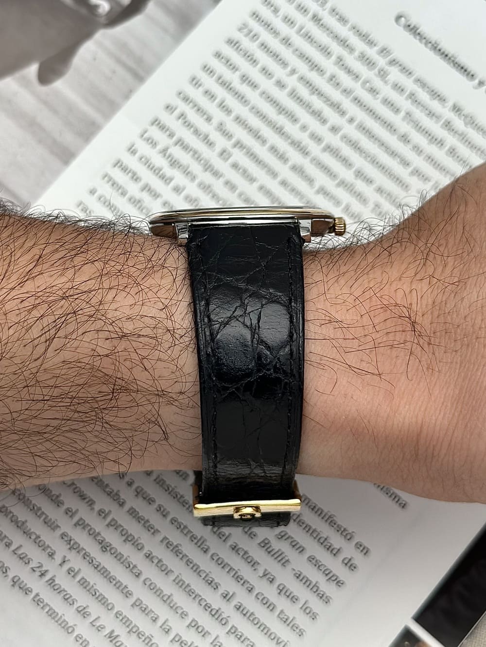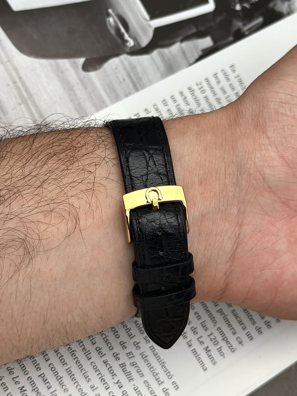 La correa de cuero negro completa el carácter del reloj. Su textura madura y su caída suave equilibran el brillo del dial dorado, generando un contraste que REALZA la estética elegante del conjunto. El reloj se posa con naturalidad en la muñeca y adquiere un aire íntimo, típico de los De Ville con vocación de presencia realmente atemporal 🎩.