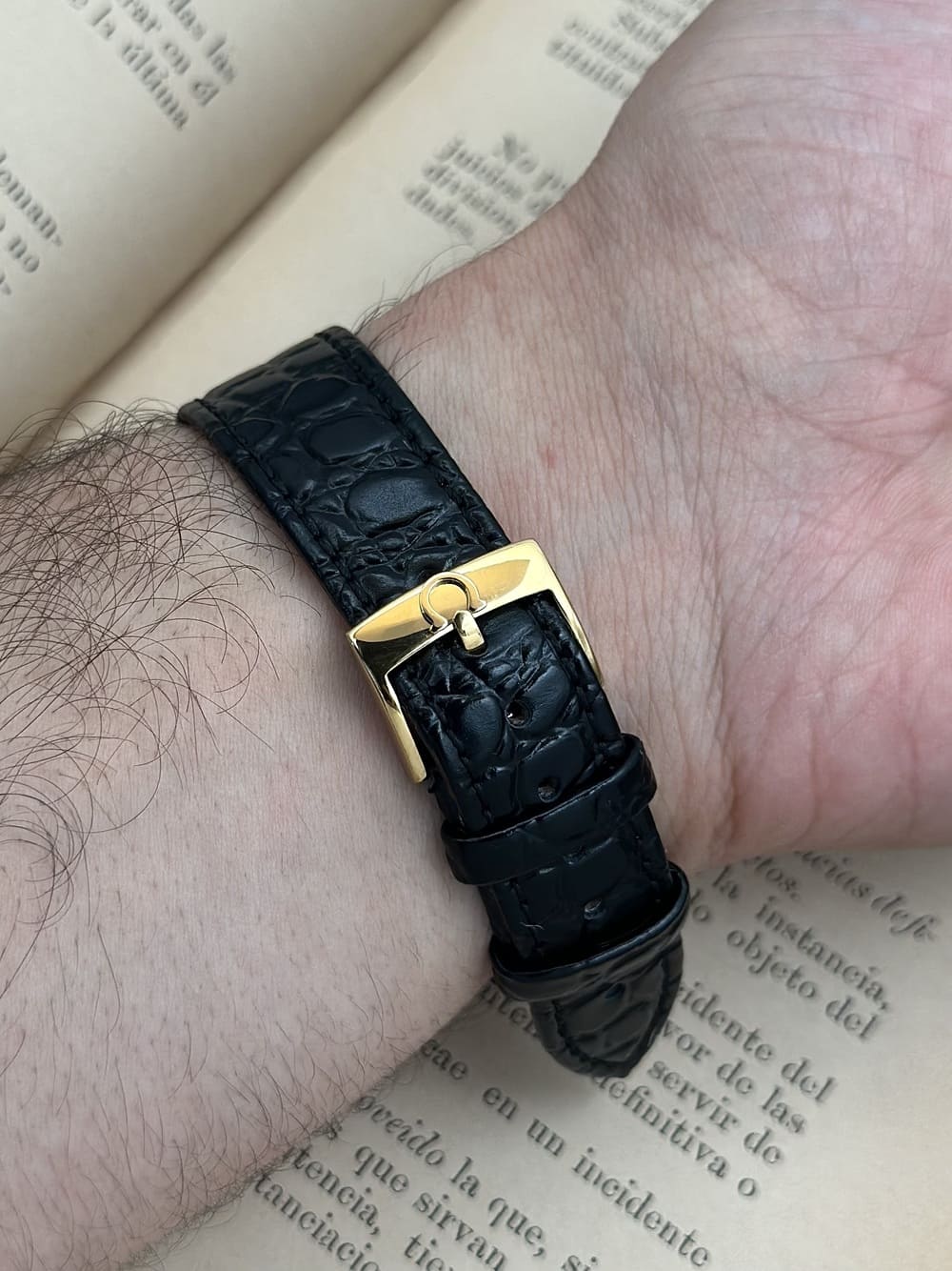 Entre la caja y la piel, aparece una correa de cuero negro que completa la estética con una sinceridad admirable. Su textura suave y su caída orgánica equilibran la luminosidad dorada del dial y del enchapado, aportando ese TOQUE CLÁSICO que subraya la identidad del reloj 🖤.