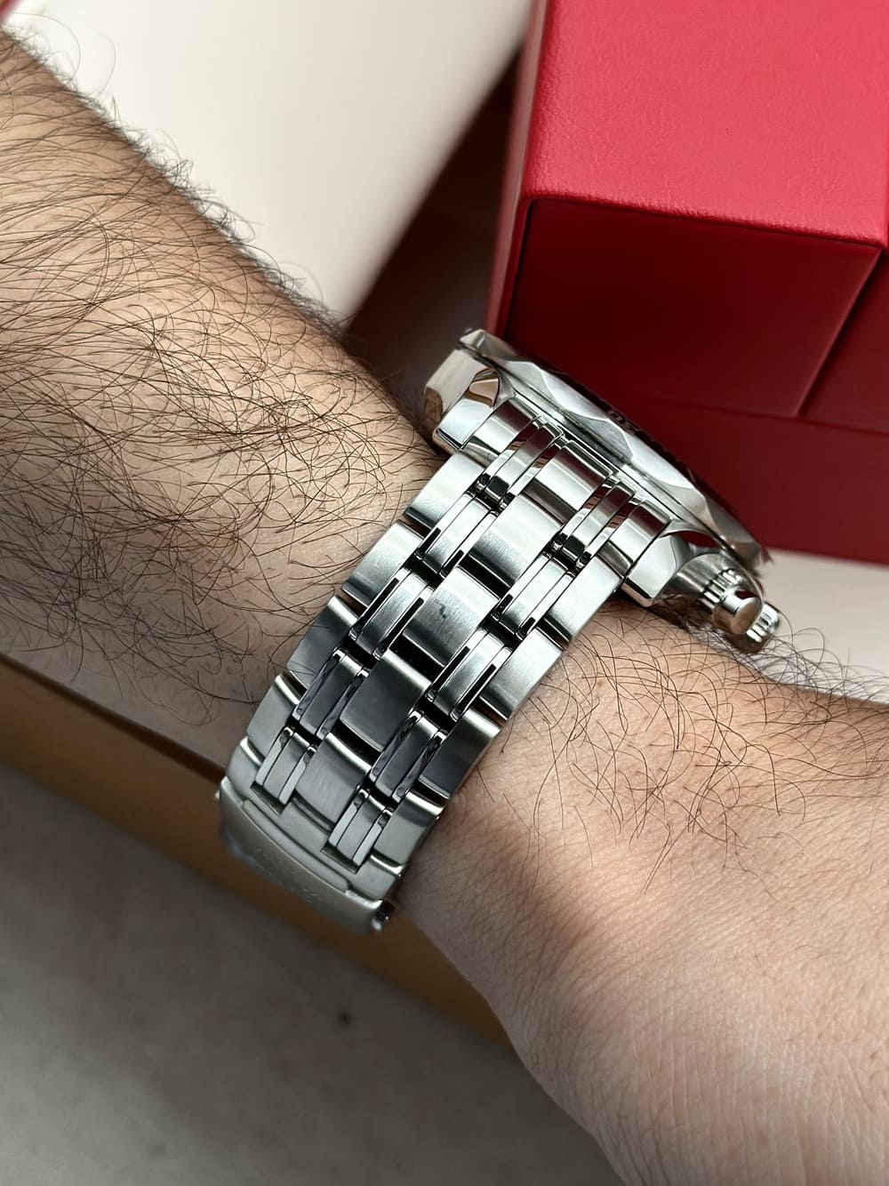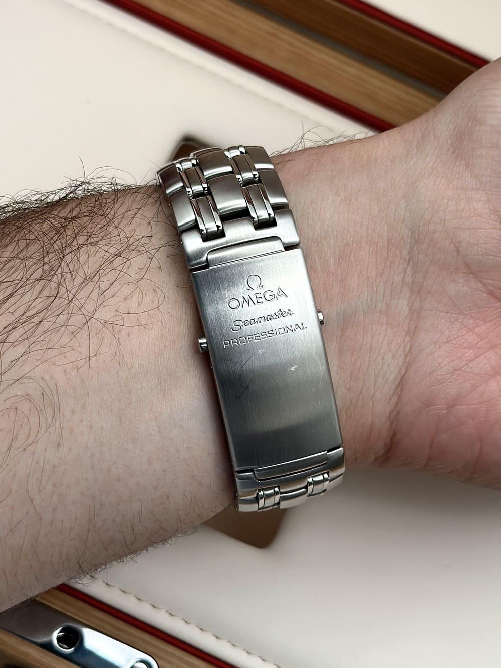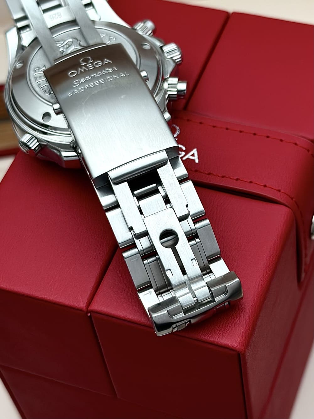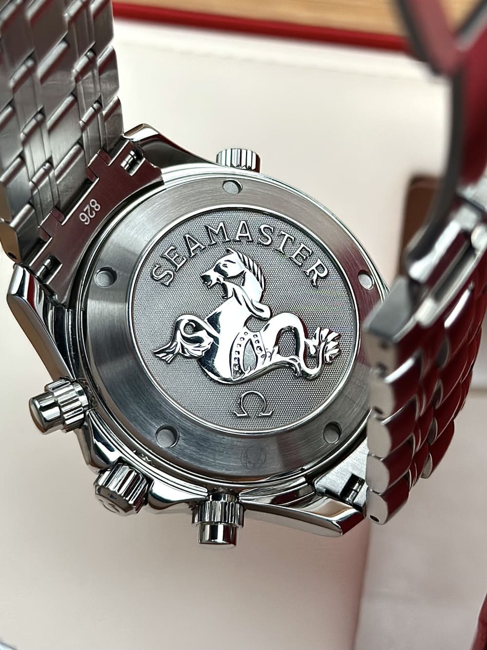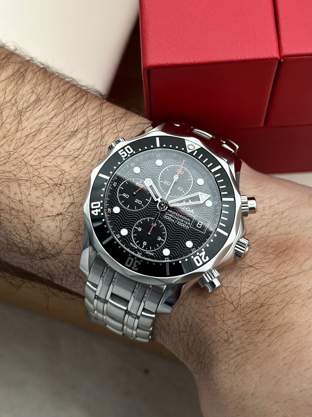 Primero, su diseño… no por ser un cronógrafo automático Seamaster, de buceo, se iba a ir con 44 o 45 mm… no, él con 41.5 mm se muestra con una naturalidad IMPECABLE en la muñeca, se adapta a la perfección con proporciones inmejorables. Sus sub-diales con acentos rojos, el logo aplicado, las olas, los índices y manecillas propios del ADN de los Seamaster Diver… TODO EN ARMONÍA ES BELLÍSIMO, coherente. Siempre contenido en los 41.5 mm que son una medida ideal. Este diámetro junto al grosor propio de este tanque resulta en un sentimiento de una herramienta sólida en muñeca, pero perfectamente disfrutable al día a día 👌.