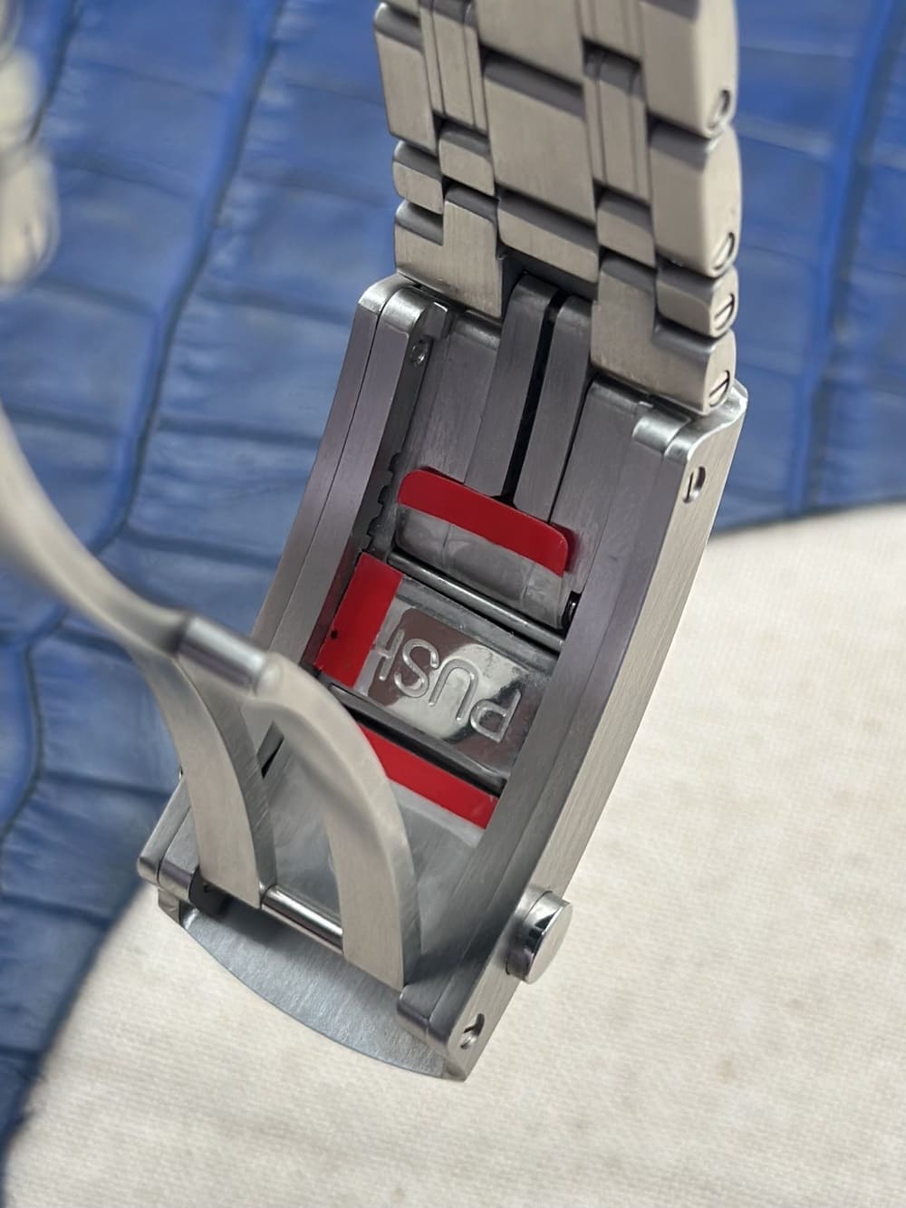 Y aquí entra en escena uno de sus puntos más altos: el brazalete de acero inoxidable, heredero del clásico diseño «cinco eslabones» del Seamaster, que alterna pulidos y cepillados con una fineza reconocible. Su ergonomía es ejemplar, abrazando la muñeca con fluidez, pero lo que realmente deslumbra es su cierre con microajuste y extensión de buceo. Con solo presionar un botón se puede regular la longitud en incrementos milimétricos, permitiendo un calce perfecto en cualquier situación: sobre la piel, con traje de buceo o en condiciones de variación de temperatura. Es un detalle de pura ingeniería moderna que convierte al brazalete en parte esencial de la experiencia del reloj. Sólido como el reloj mismo.