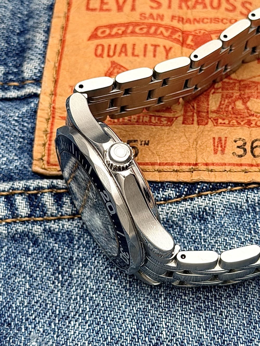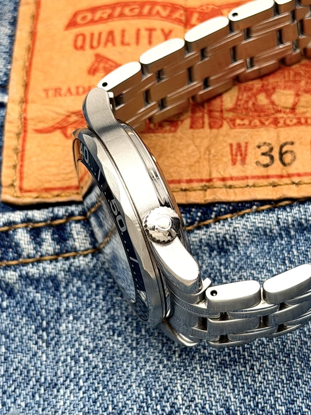 Su diseño, idéntico en alma al de su contraparte de 41 mm, despliega sobre el dial negro el característico patrón de ondas, que evoca la superficie del mar bajo la luz. Los grandes índices luminosos aplicados y las manecillas tipo espada, IMPOSIBLE MÁS LEGIBLES 😱, de proporciones perfectas, transmiten ese aire de reloj-instrumento auténtico, donde cada elemento existe por una razón. Y el lume… vaya, probablemente el material luminiscente MÁS POTENTE DE TODOS. Sí, incluso más reactivo y legible que ejemplares actuales. Siempre los «Peter Blake» tiene esa luminiscencia tan fuerte, tan reactiva y duradera característica 👏.