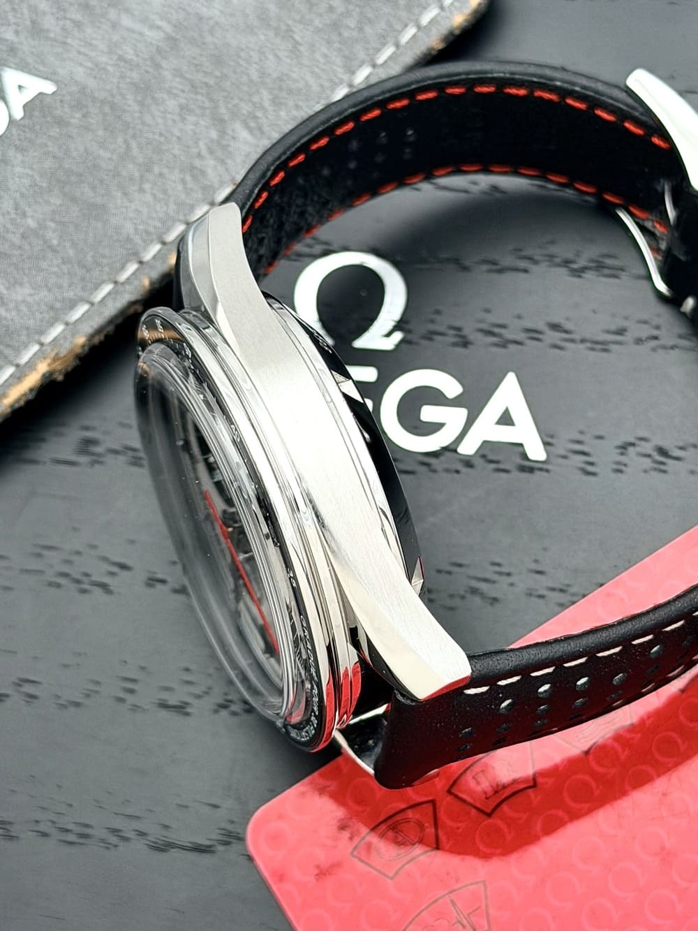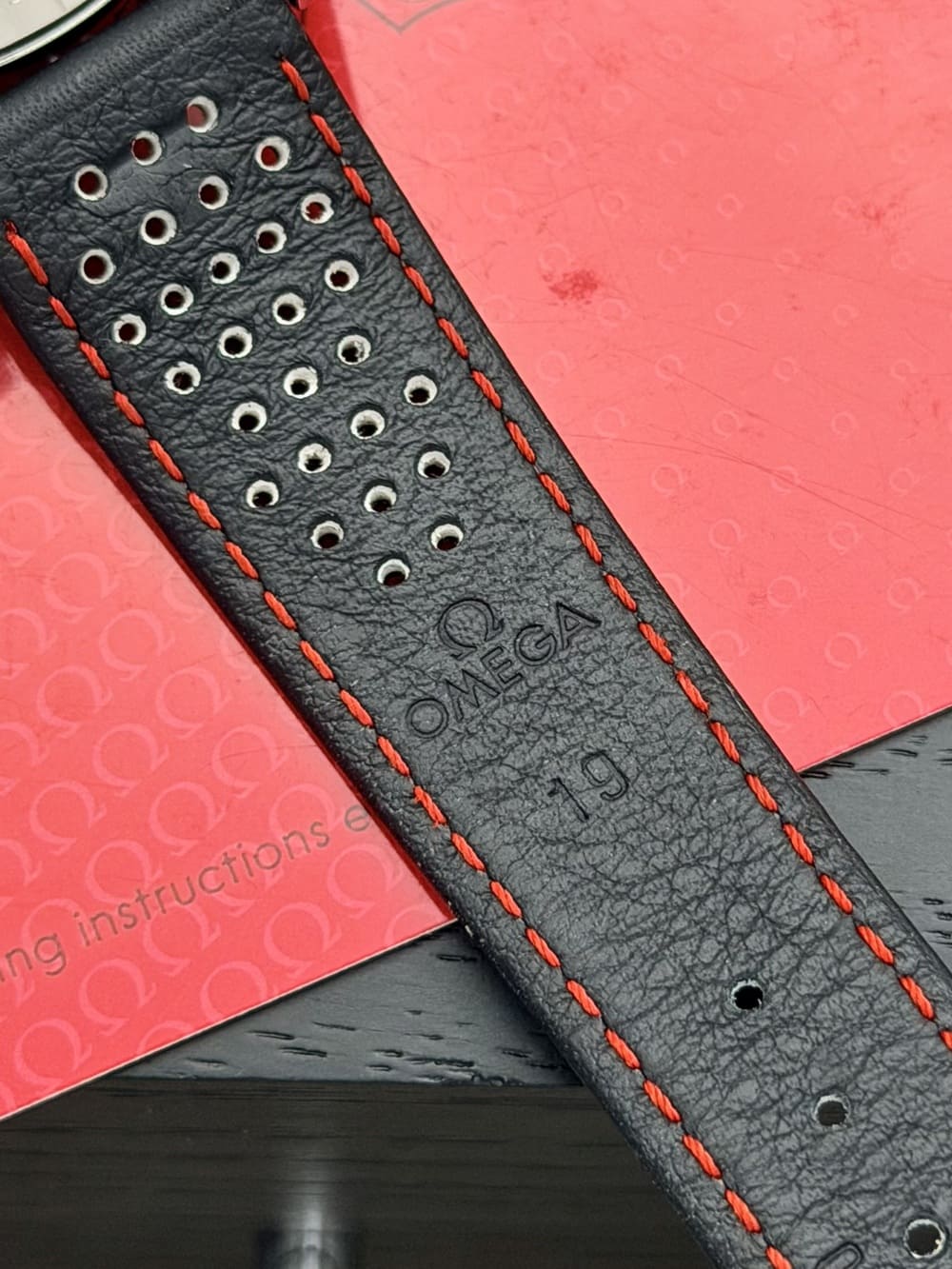Su correa original de cuero negro entrega una textura mate que equilibra la lectura técnica del reloj, junto con ofrecer un estilo «racing» que bien conversa con el diseño del dial, así como con los veloces acentos rojos… guiños directos a la esencia veloz original de la línea Speedmaster.