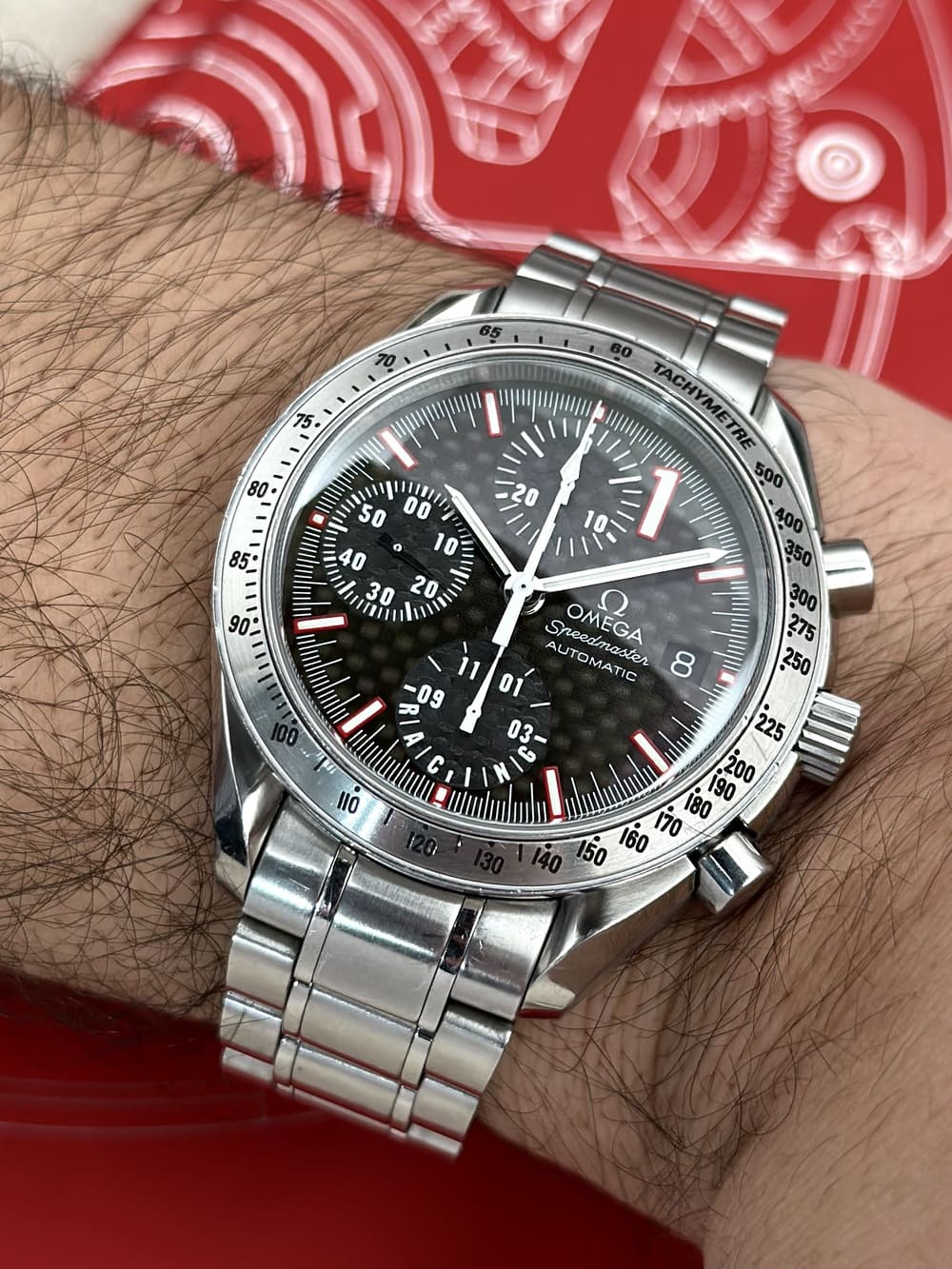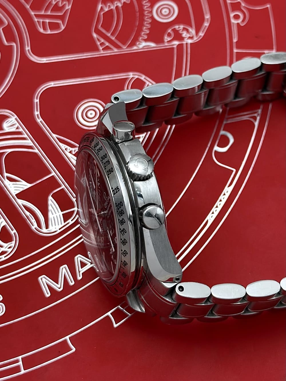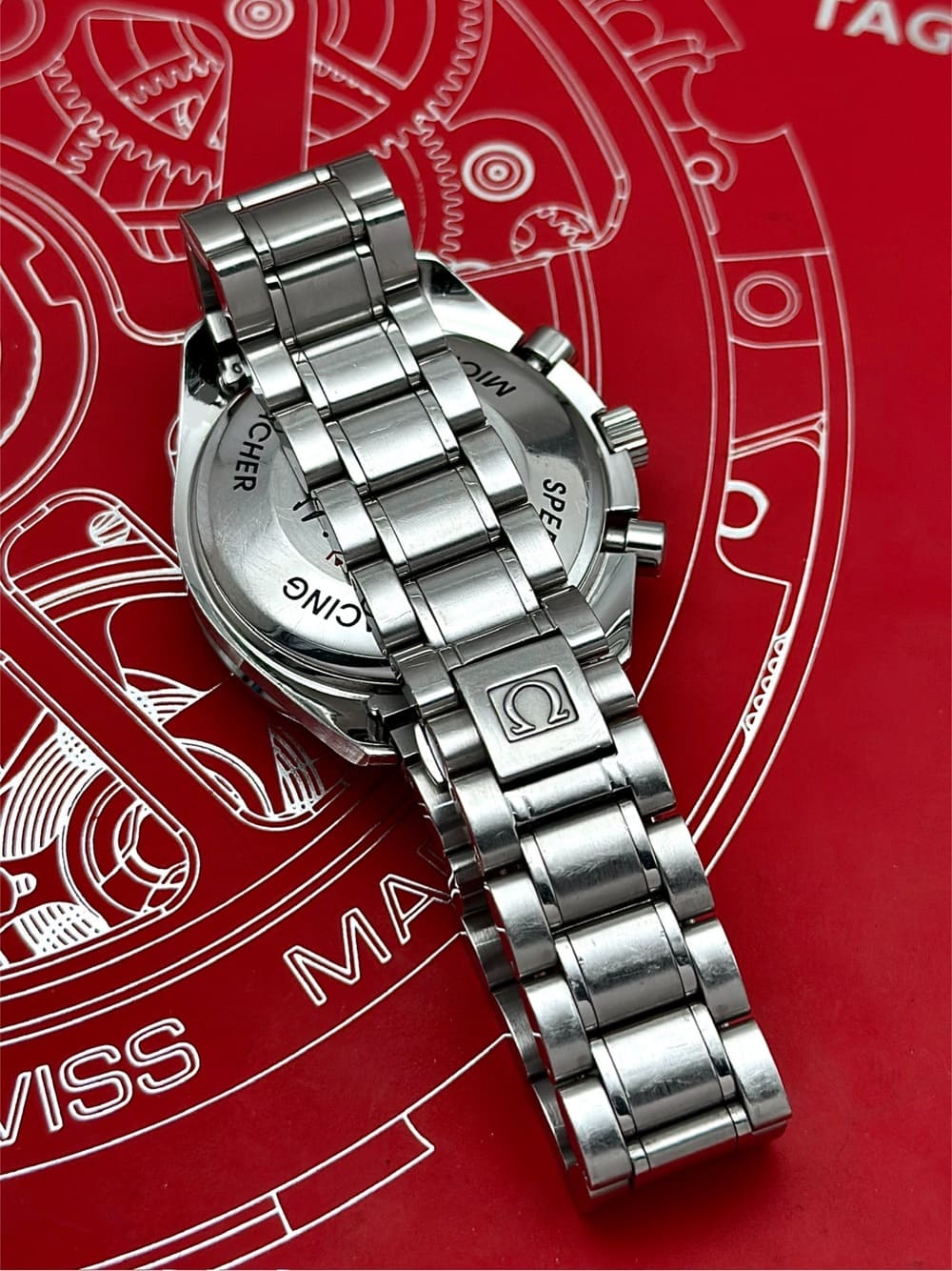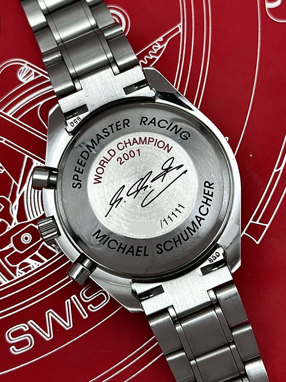 El reverso, con la firma grabada de Schumacher y la inscripción «World Champion 2001» en ROJO 🔴, sella la conexión entre esta pieza y uno de los nombres más grandes del automovilismo, de parte de una de las firmas más importantes de la historia de la relojería. Señores, este Speedmaster no es cualquiera. No es equiparable a otros similares, aun con las mismas especificaciones técnicas. Es un capítulo especial en la relación de Omega con la velocidad, de la línea Speedmaster con su más pura esencia, que muchas veces se ve desplazada por la gran fama del reloj lunar: el automovilismo 🏎️🏁.