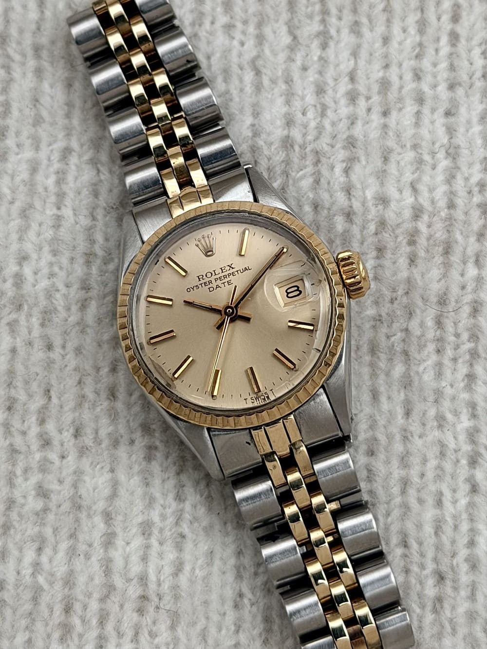 No hace falta buscar demasiado para encontrar su historia: está ahí, escrita en cada CURVA de la caja, en cada REFLEJO del Rolesor, en cada TRAZO del dial. La línea para damas de las líneas Date y Datejust nació en 1957 para llevar al territorio femenino el mismo lenguaje que había hecho grande al Oyster masculino: HERMETICIDAD ABSOLUTA, MOVIMIENTO AUTOMÁTICO y esa sensación de REFINAMIENTO que Rolex perfeccionó desde los años 30. La referencia 6517 honra ese legado con fidelidad encantadora. Y si uno observa con atención la esfera, descubre otro detalle histórico: el brillo cálido del sol aplicado durante los años 70, esa textura tornasol que Rolex dominaba con maestría y que hoy se reconoce al instante. Los índices aplicados con un volumen generoso, facetados, se alzan como pequeñas columnas que ordenan el tiempo, mientras las manecillas -delgadas, precisas, clásicas- avanzan con una tranquilidad que enamora 😍. A las 3, la ventana de fecha se posa donde siempre debió estar, con la icónica lupa sobre el cristal. Aquí, cada detalle sabe de tradición.