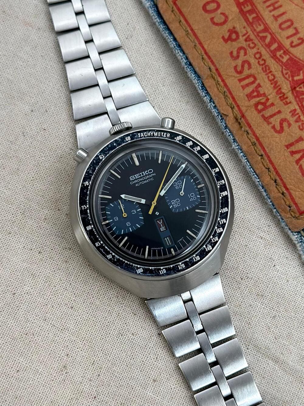 Este movimiento en sí es HISTORIA, pero miren el diseño del reloj 👏… el Bullhead de dial negro con detalles azules 😍, en destacables condiciones desde el año 1976 😯. Ese carácter fuerte de cronógrafo deportivo con el negro y el azul es natural, y destacando sobre todo la manecilla central amarilla 🟡 el efecto automovilístico queda claro. Adicionalmente, la especial distribución de sus dos sub-esferas junto con la ubicación de sus pulsadores lo hacen realmente único… y para colmo, CON SU BRAZALETE FISHBONE ORIGINAL.
