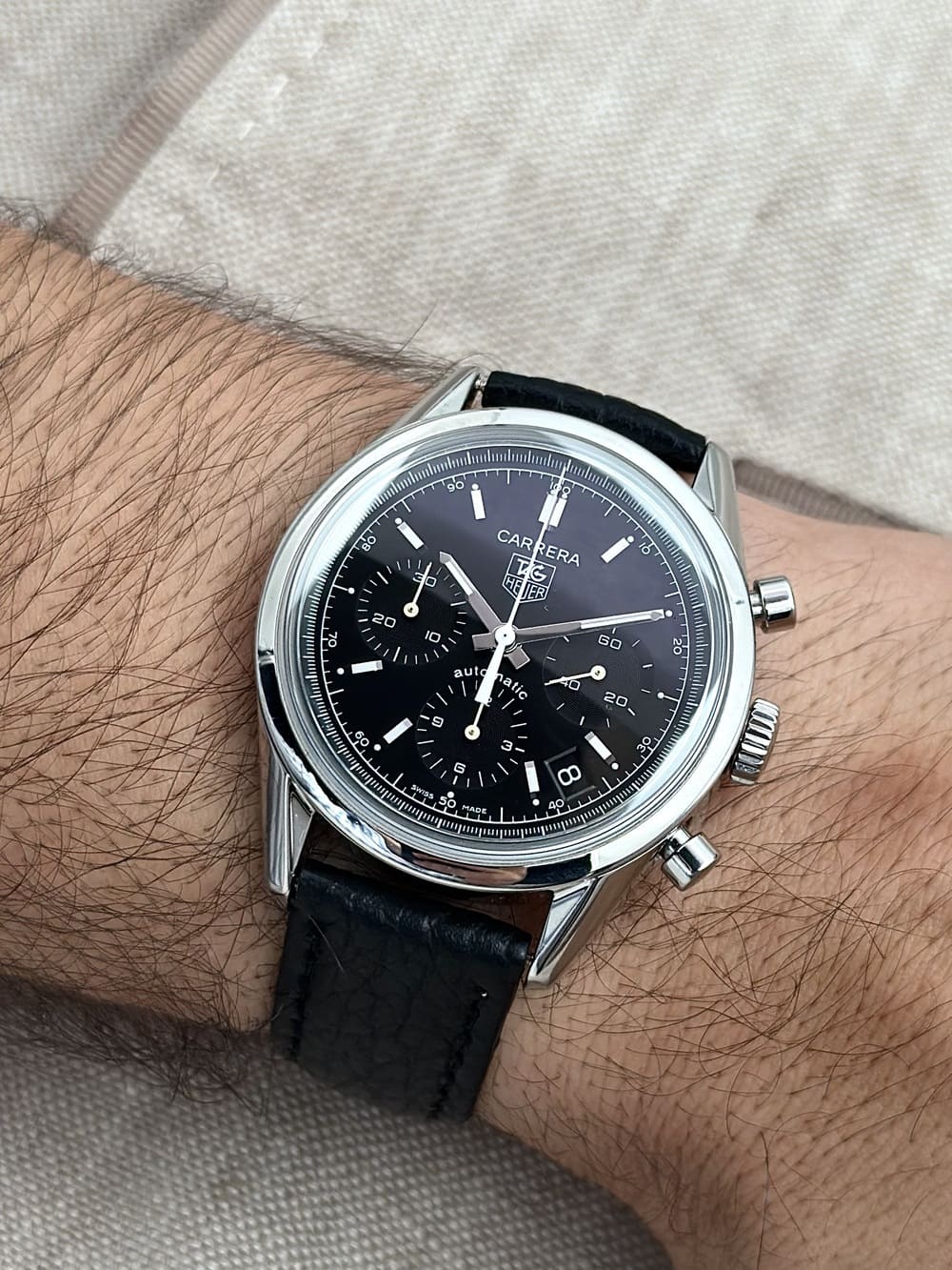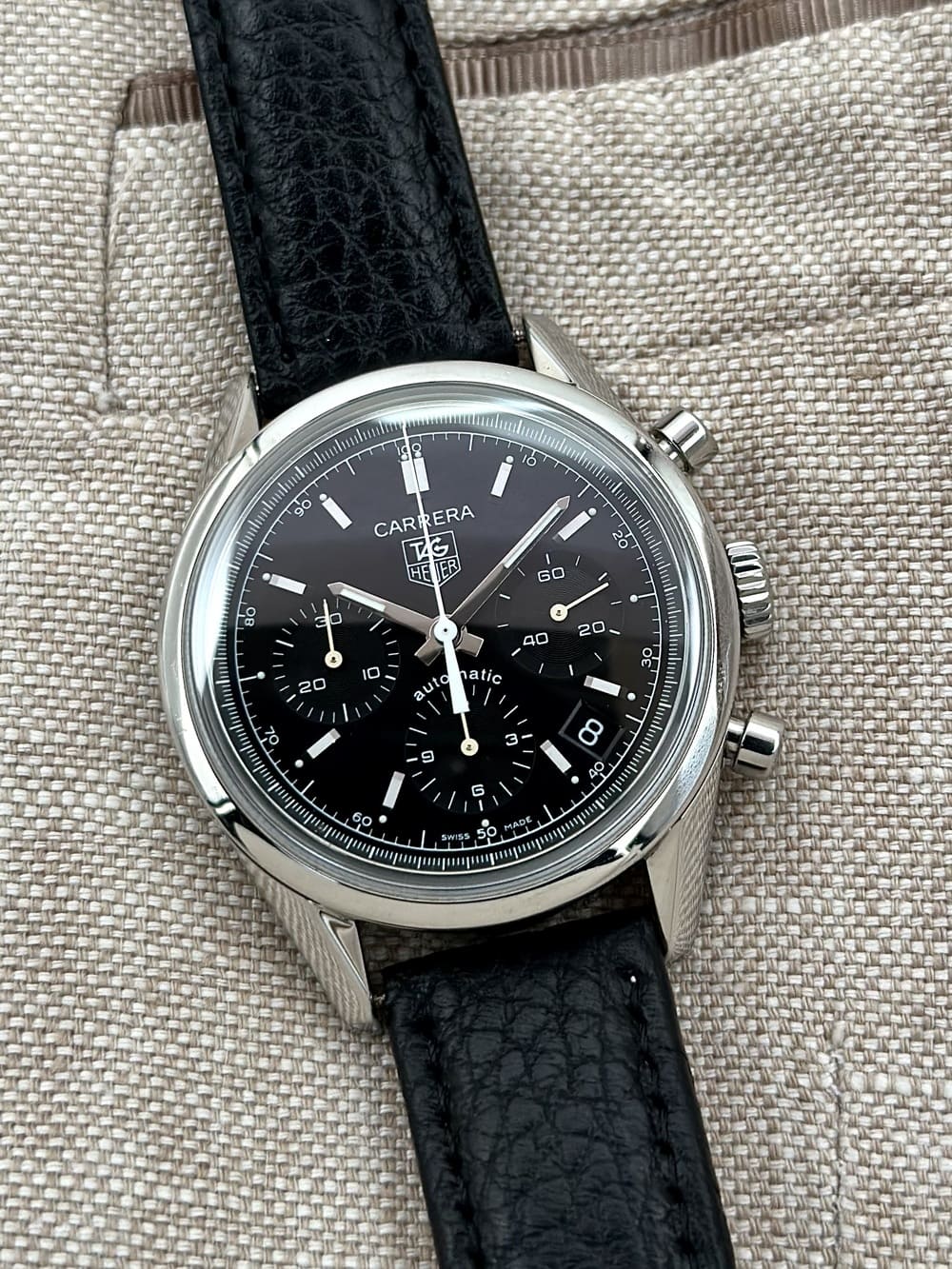 Lanzado a inicios de los años 2000, este modelo representa una de las primeras reediciones serias del mítico Carrera 2447 de los años 60: un diseño limpio, legible, atemporal, sin aspavientos, pensado desde el amor por las proporciones y la funcionalidad pura. Es el reloj que un piloto de autos de época soñaría llevar al volante de su bólido. Pero aquí, sin embargo, lo tenemos con todas las virtudes técnicas del siglo XXI: caja sólida de acero, cristal de zafiro abombado, y el calibre automático Heuer 17 latiendo con precisión suiza al interior 👌… es una fusión de conceptos que, de forma independiente, no fallan… y que juntos, con insuperables 👏.