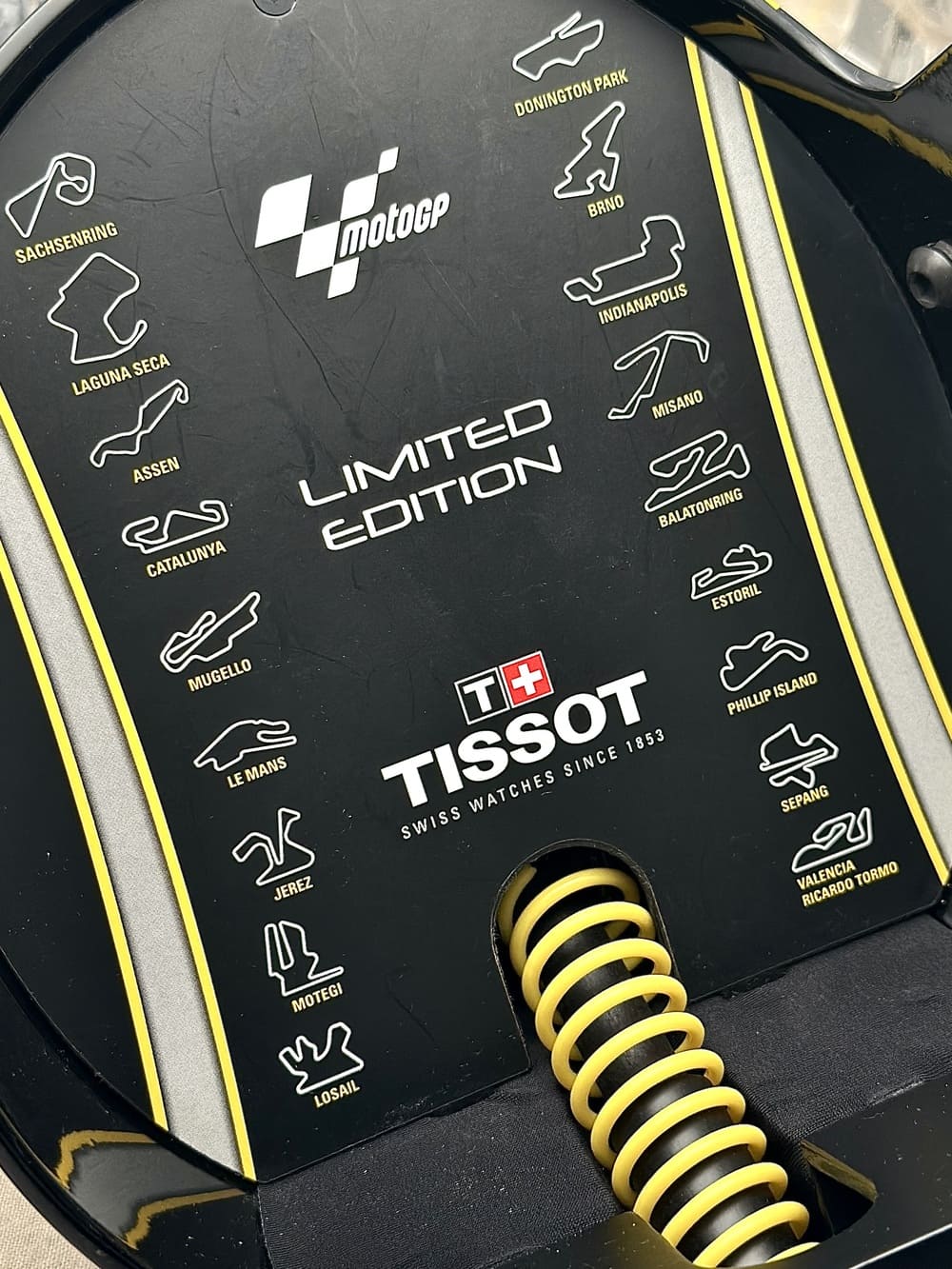 El conjunto alcanza su máxima expresión con su estuche especial. La caja con forma de casco de motocicleta transforma este reloj en un AUTÉNTICO OBJETO DE CULTO. En su interior, 18 TAPAS INTERCAMBIABLES representan los distintos circuitos del campeonato mundial de MotoGP de ese año, convirtido en un archivo tangible de la temporada 🏆.