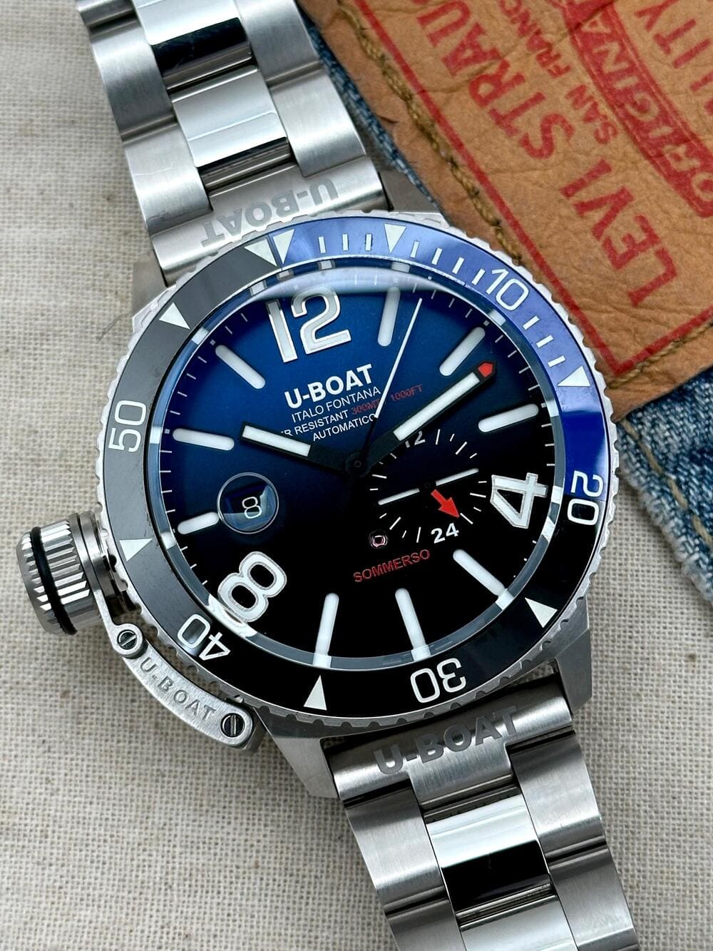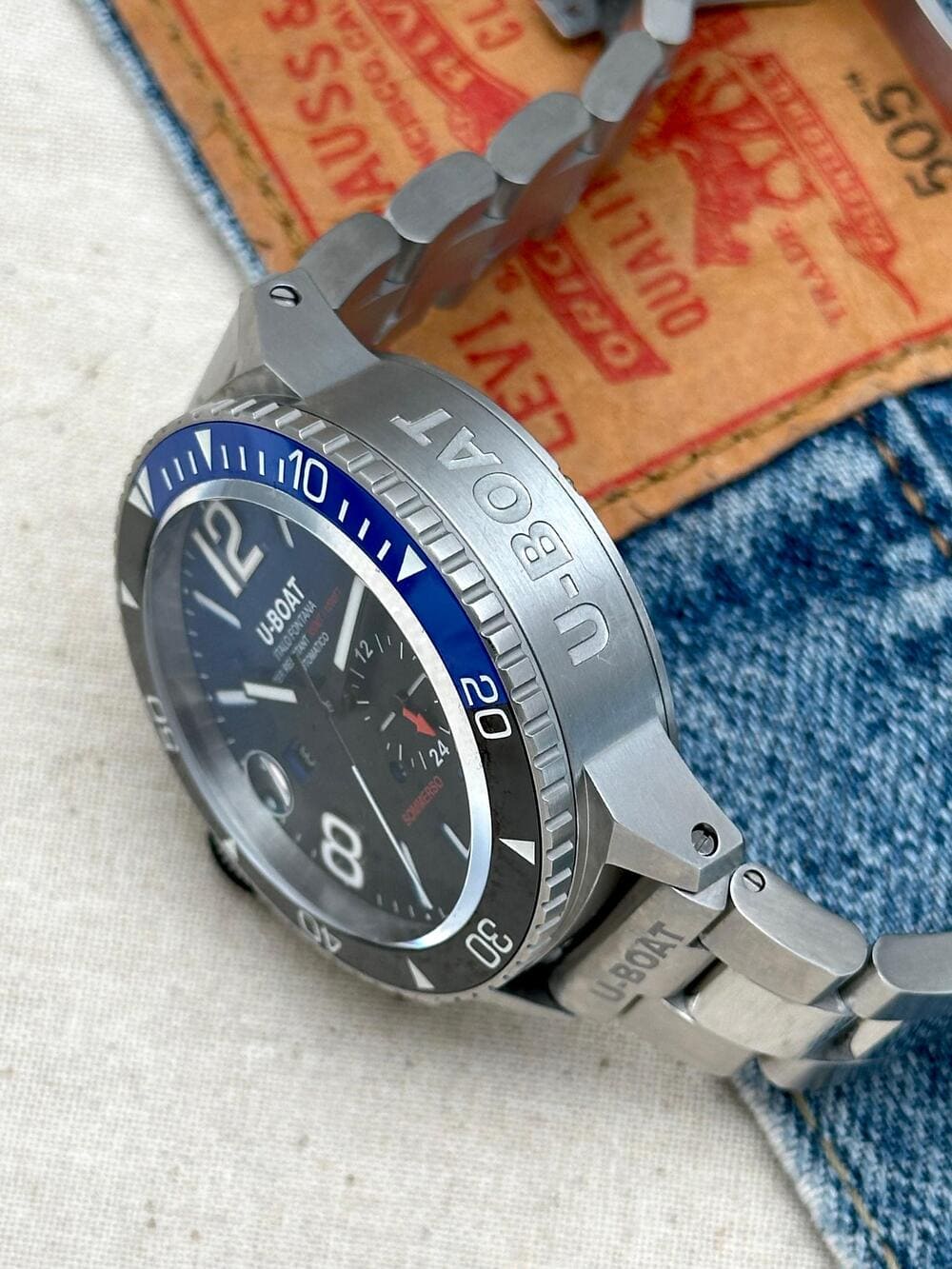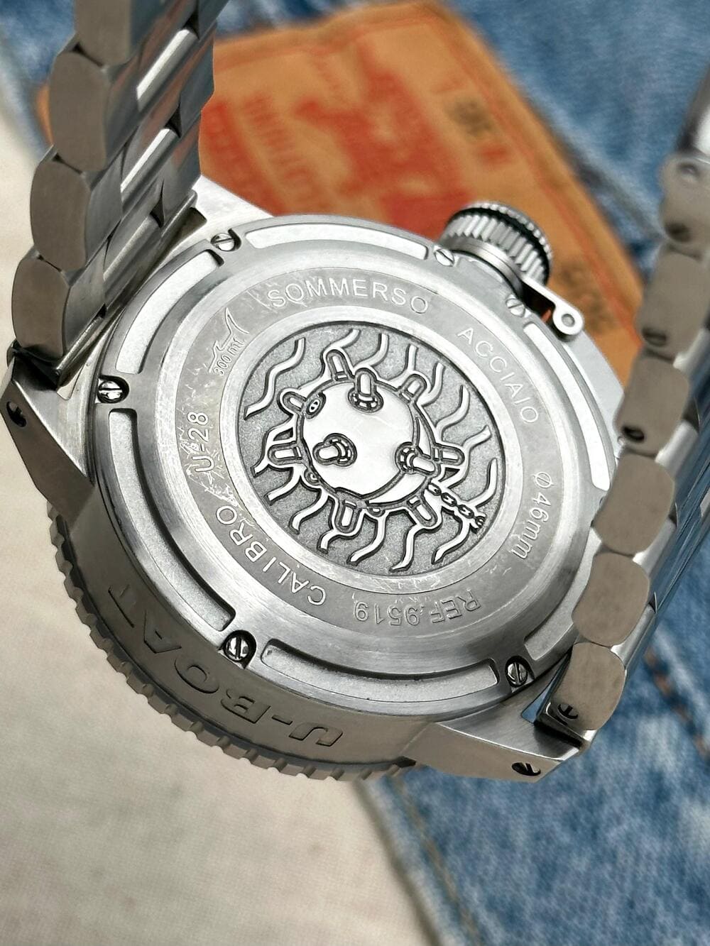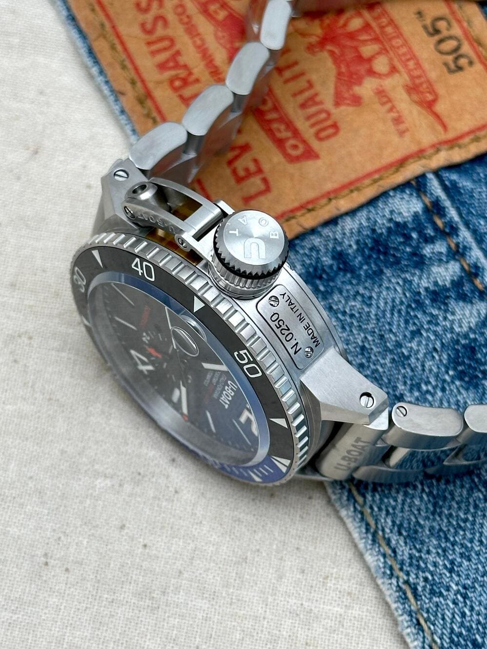 Pero hay detalles que elevan aún más esta pieza, como su brazalete de acero inoxidable macizo, que no solo es imponente y cómodo, sino que además está grabado con el nombre U-BOAT tanto en el primer eslabón como en el cierre. Son esas inscripciones las que recuerdan, en cada mirada, que este NO es un reloj convencional… sino una declaración de carácter 🤿, un instrumento que, además, está impecablemente diseñado para el ojo.