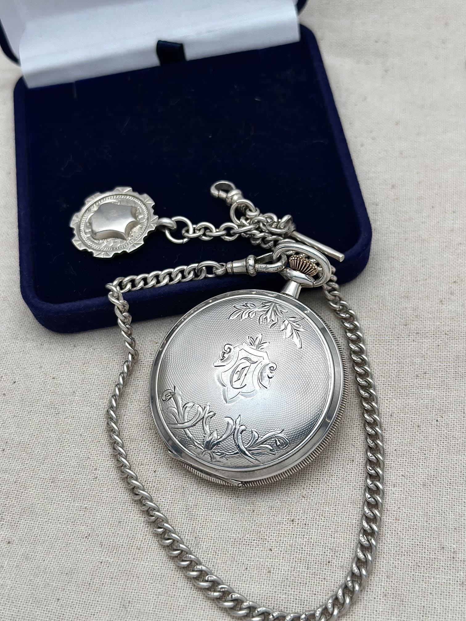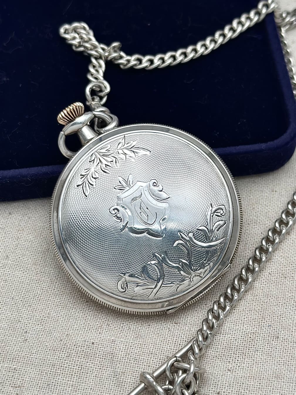 Su caja de plata con bisagra, delicadamente grabada en el reverso, se abre como una cápsula del tiempo que conserva no solo un mecanismo, sino también un espíritu. La cadena original y el medallón que lo acompañan lo convierten en un conjunto completo, digno de un museo, pero dispuesto a seguir latiendo en la mano de un coleccionista que sepa apreciarlo… porque relojes como estos no se ven a diario, y no todos gozan de condiciones tan espectaculares como este.